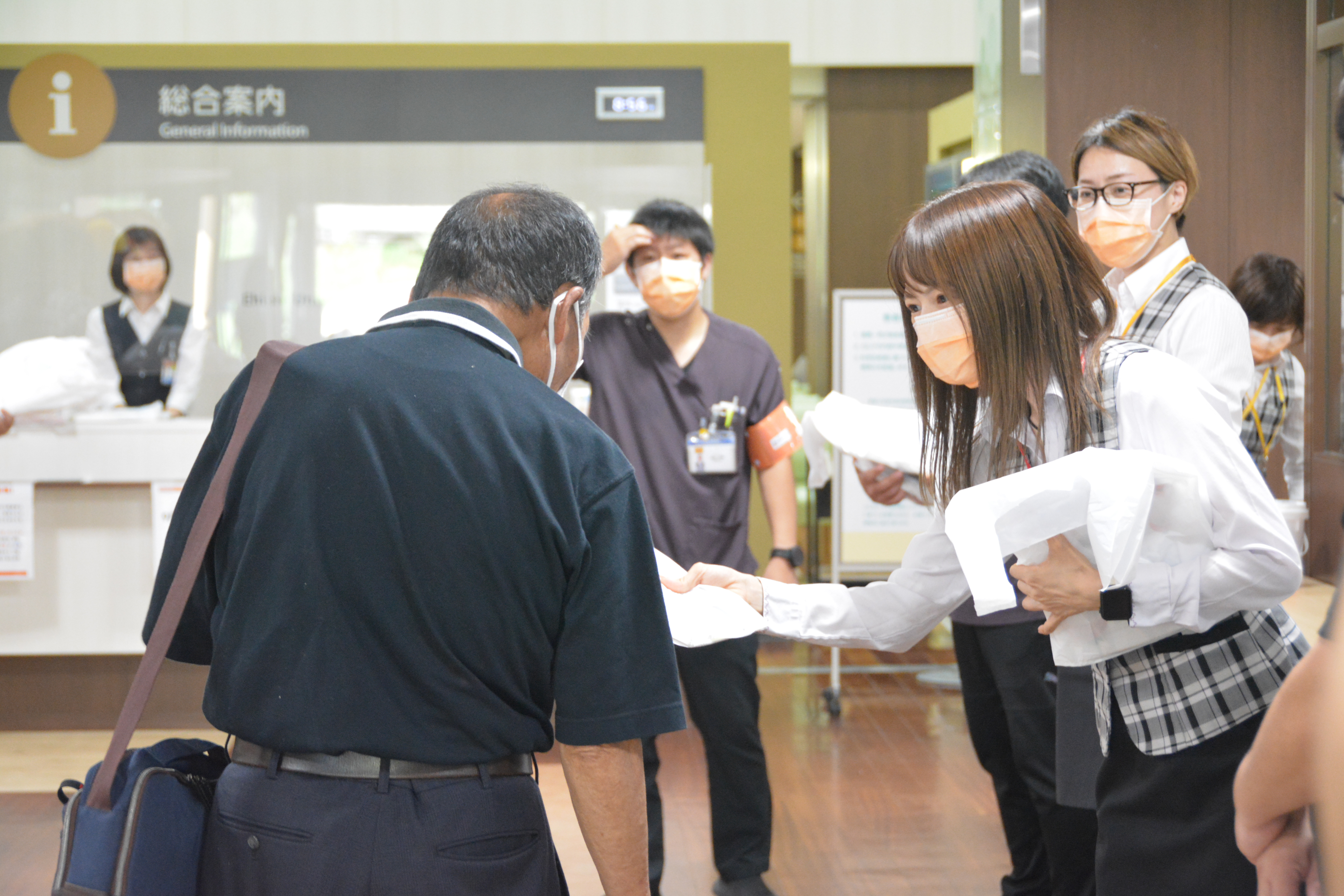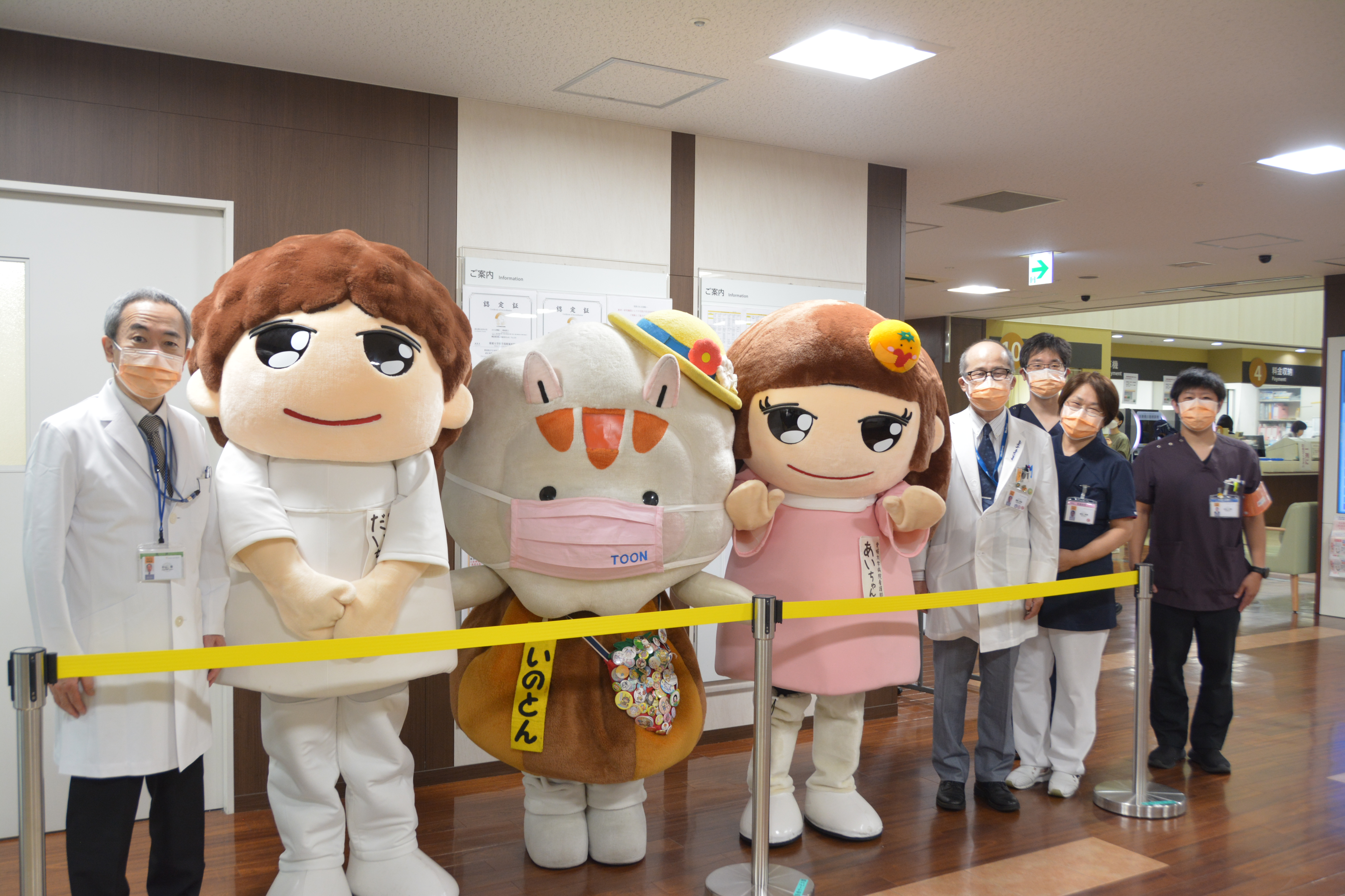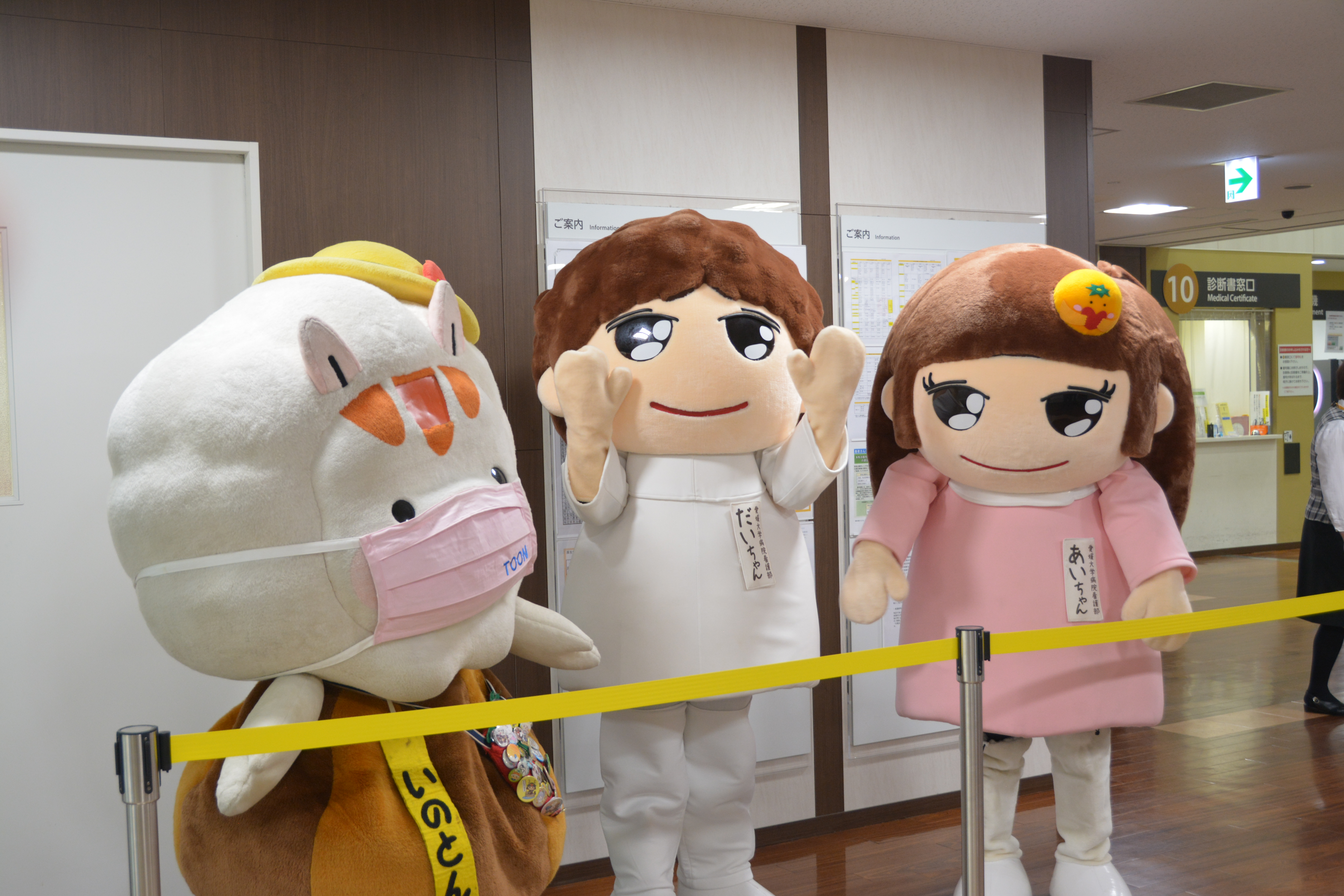 当院では、当日8時30分から、来院いただいた患者さんに向けて、患者安全の啓発物の配布を行いました。正面玄関では、附属病院看護部マスコットキャラクターの「あいちゃん」「だいちゃん」と、応援に駆けつけてくれた東温市イメージキャラクターの「いのとん」が、スタッフと一緒に患者さんを出迎えてくれました。