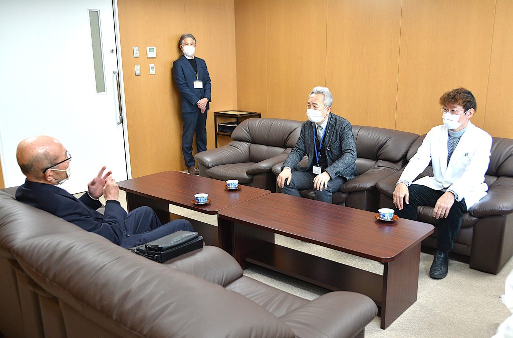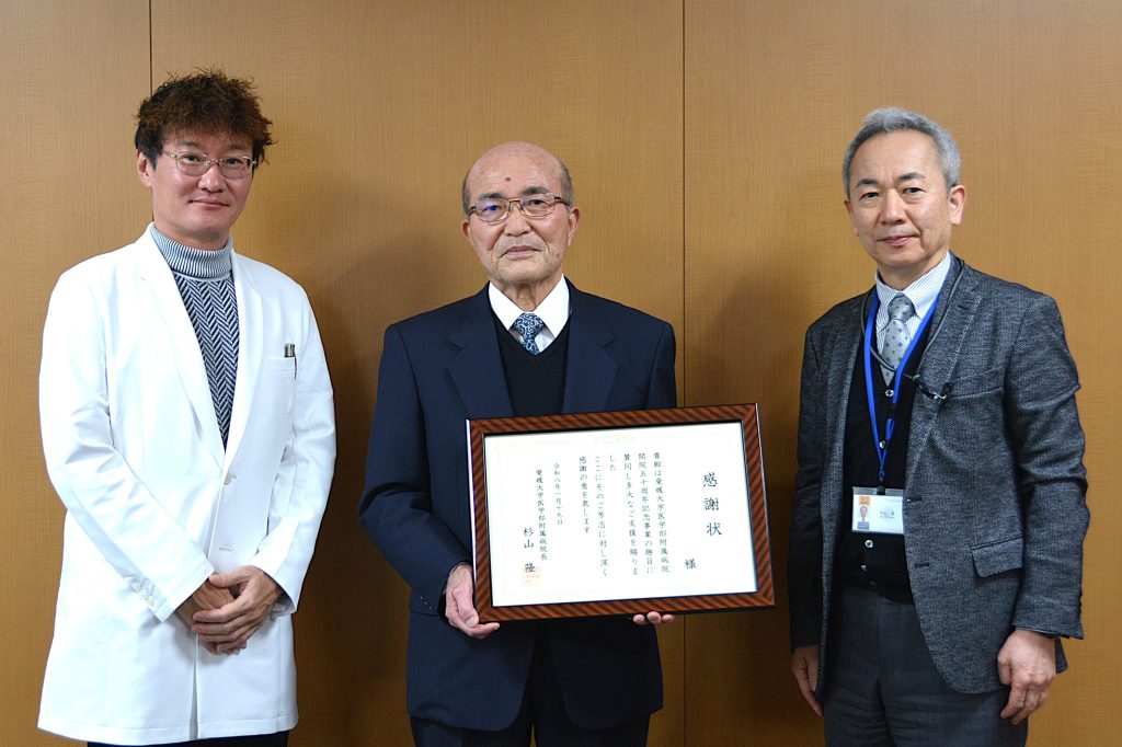 当日は、杉山病院長から寄附者の方へ、御礼の言葉とともに感謝状が贈呈され、引き続き、開院50周年記念事業寄附WG長の城戸輝仁教授を交えて懇談しました。
